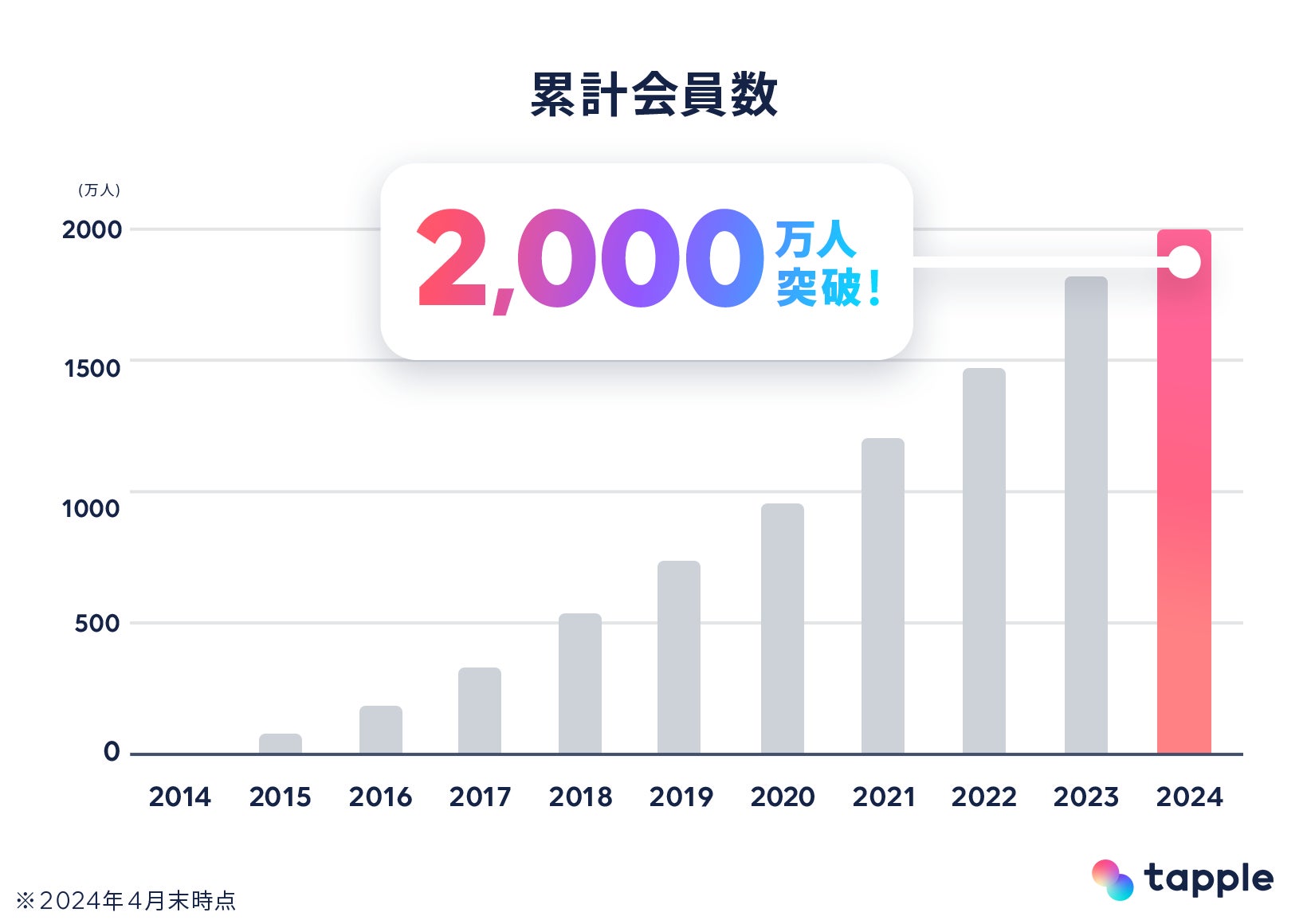 「タップル」は2014年のサービス開始時から着々と累計会員数を伸ばし、2024年4月末時点で延べ2,000万人に到達しました。
