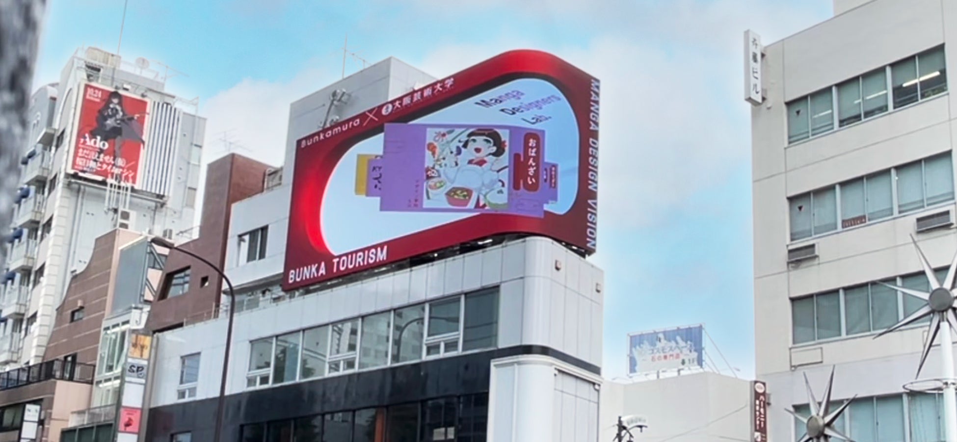 原宿・竹下口交差点に面したT’s oneビルの屋上広告ビジョンにて、10月31日までの期間限定で、「マンガデザインで文化ツーリズム」掲載作品の一部を鮮やかな3Dビジョンでご覧いただけます。額縁から飛び出すSNS+デジタルOOH作品の数々をどうぞお楽しみください。