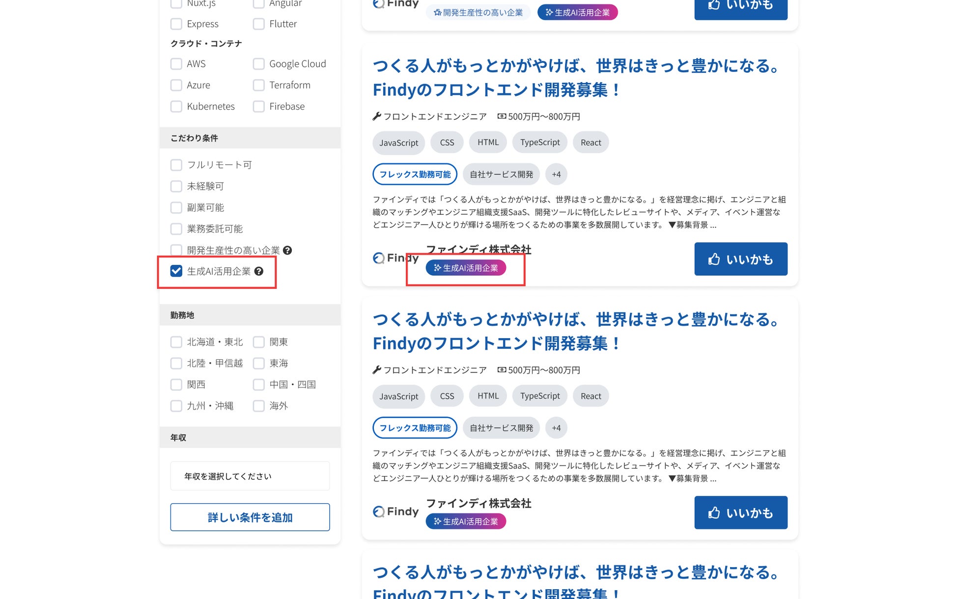 エンジニアプラットフォームを提供するファインディ株式会社(東京都品川区、代表取締役:山田 裕一朗、以下「当社」)は、IT/Webエンジニアの転職サービス「Findy」に、求人を出している企業の「生成AI活用状況」を可視化する検索機能を追加したことを発表します。これにより、企業は自社の生成AI実装度やそのレベルに応じた人材採用強化に繋がるとともに、利用ユーザーは各社の生成AI活用情報に基づいてより自身にマッチした求人の検索を行うことができるようになります。