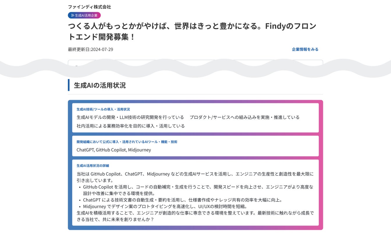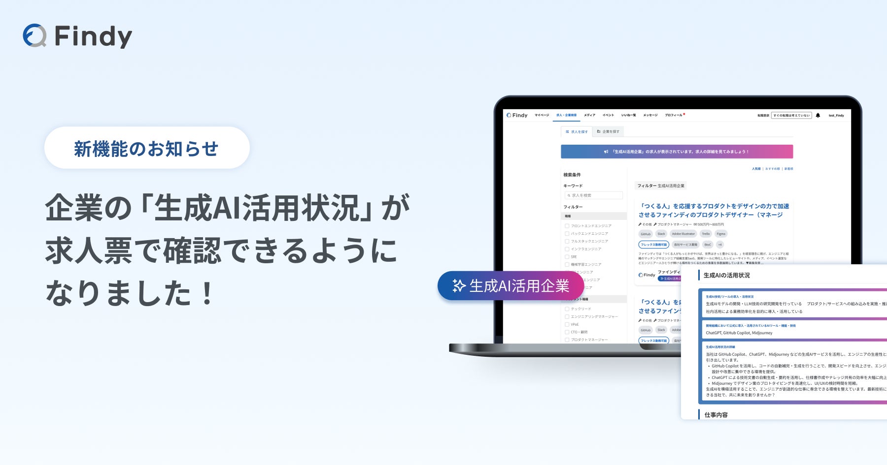 【新機能発表】IT/Webエンジニアの転職サービス「Findy」企業の「生成AI活用状況」を求人票へ反映!マッチングを加速。生成AIの普及によるエンジニアの新たな採用トレンドに対応