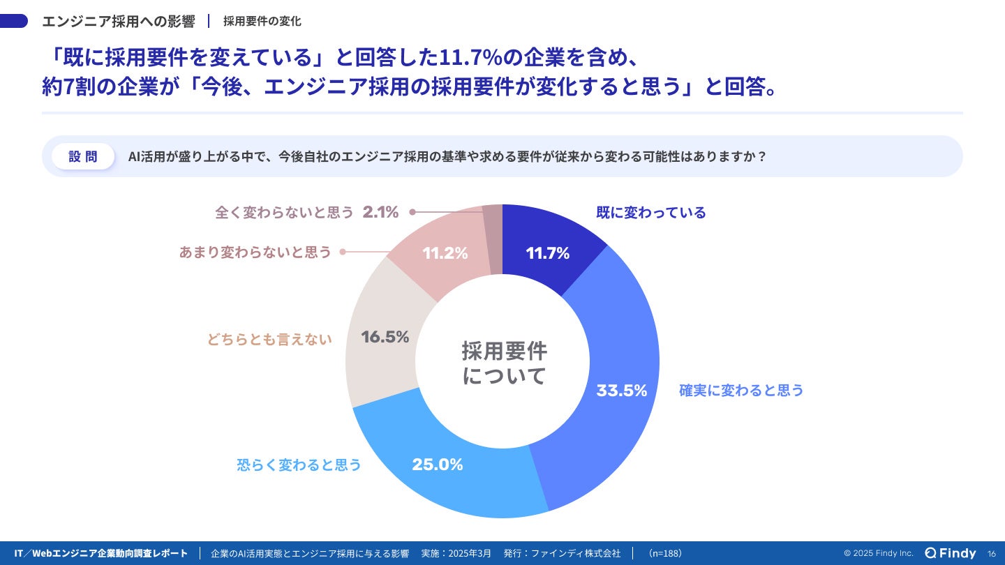 今般の生成AI技術の発展、および各社から提供されるツールやライブラリ等の充実により、IT/Webエンジニア個人や開発現場における生成AI活用は一般化しつつあります。当社のユーザー向け調査では、既に91.8%のIT/Webエンジニアが業務で生成AIを活用しており、さらに「直近1年間で知って興味を持った企業」として、先進的なAI活用や技術開示を進める企業が注目度を高めていることが明らかになりました(※1)。また、企業向け調査では、70.2%の企業がAI活用の発展により自社のエンジニア採用の基準や求める要件が「既に変わっている」または「変わると思う」と回答(※2)し、AIにより採用要件が変化しつつあることが示唆されました。