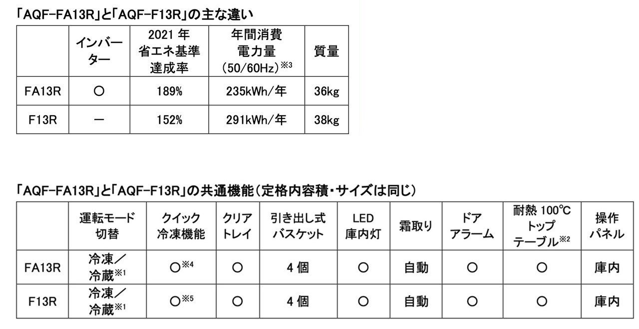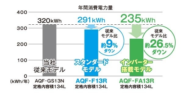 2025年4月に発売したスタンダードモデル「AQF-F13R」をアップグレードした「AQF-FA13R」は、新たにインバーターコンプレッサーを採用することで、省エネ性能と静音性を強化した製品です。当社従来モデル(AQF-GS13N)と比較し、スタンダードモデル「AQF-F13R」の年間消費電力量は約9%ダウン、今回発売する「AQF-FA13R」は約26.5%ダウンし、さらに家計にやさしい省エネ設計に進化しました。