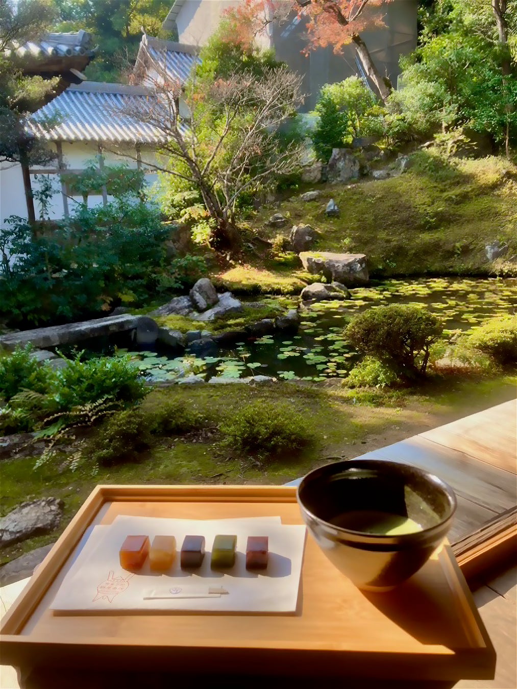 「鶴屋吉信ようかん」は、小倉や抹茶、黒糖などこだわりの素材を手のひらサイズに仕上げた、風味あふれる羊羹です。晩秋に色づく境内をゆったりとご覧いただきながら、あたたかいお抹茶と美味しい和菓子で季節の美しさを感じていただけますと幸いです。