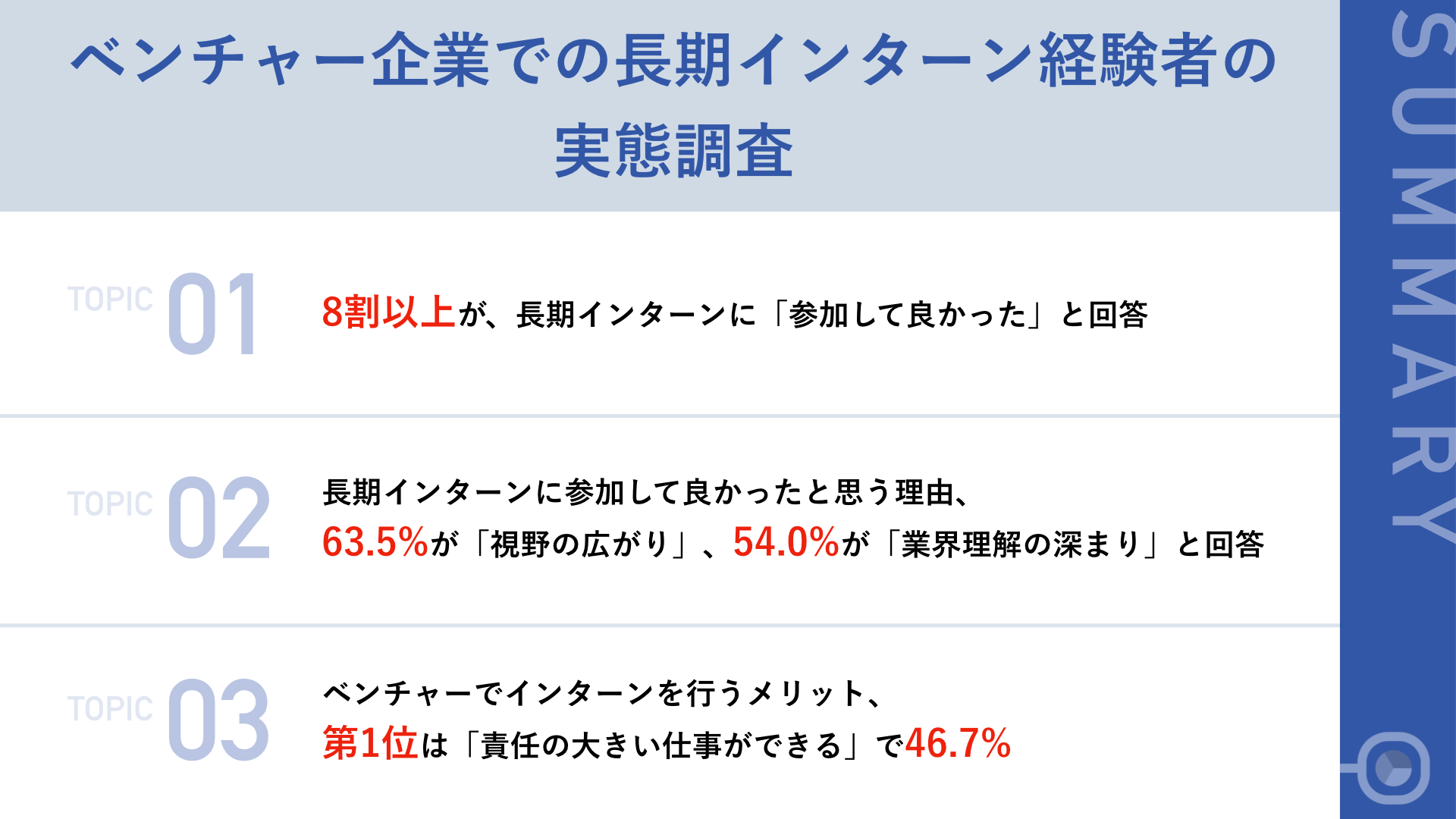 今回の調査では、長期インターンシップが学生にとって、視野を広げ、業界や業種の理解を深める機会となっていることが分かりました。中でも、ベンチャー企業でのインターンシップは、即戦力として責任の大きい仕事を任されることも多く、本格的に社会人として活躍するための礎となるメリットを実感している場合が多いことも明らかとなりました。今後、インターンシップに参加される予定の学生の皆様が、今回の調査で語られた先輩たちのエピソードを元に、様々な経験を積み、活躍されることを願っています。