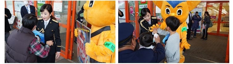 イベント終了後、伍代支援官は、地域住民へ向けて特殊詐欺被害防止の啓発物を配布しました。