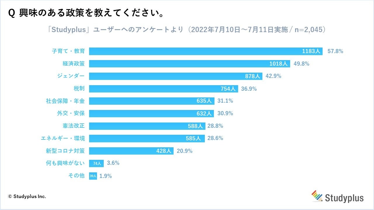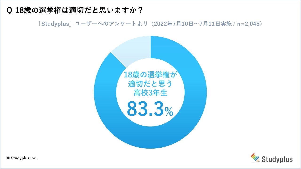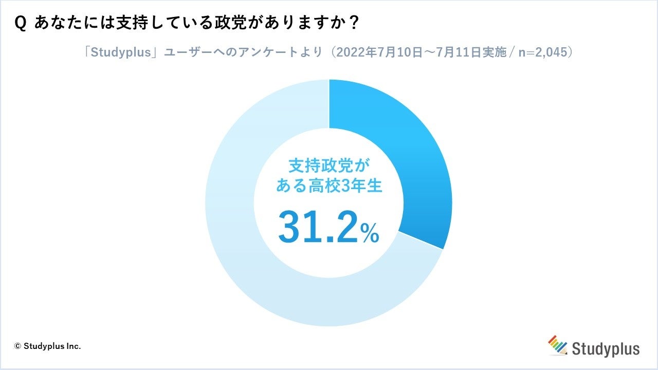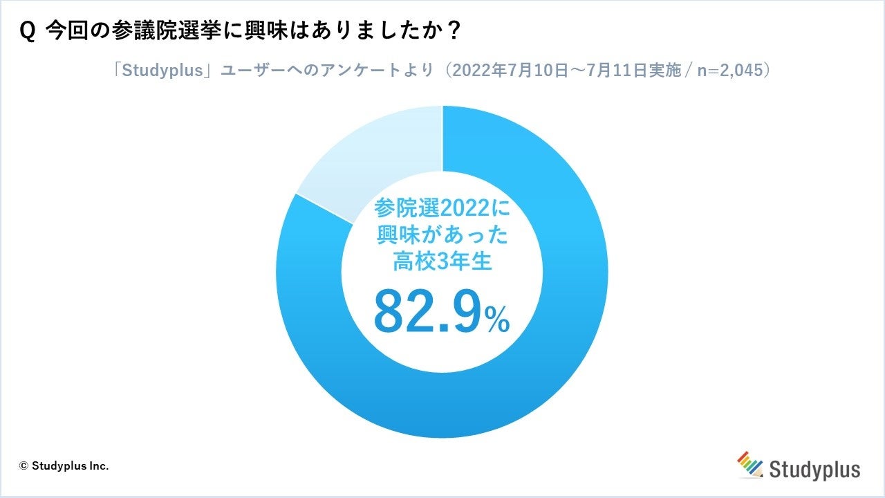 スタディプラス株式会社(本社:東京都千代田区、代表取締役:廣瀬高志、以下スタディプラス)のStudyplusトレンド研究所は、2022年7月10日~7月11日にかけて、学習管理アプリ「Studyplus」上で現役高校3年生のユーザーを対象に「第26回参議院議員通常選挙に関するアンケート調査」を実施、2,045人から調査に対する回答を得ましたので概要をご報告します。