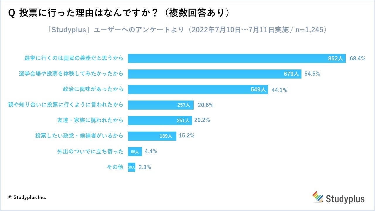 ・2位の「選挙会場や投票を体験してみたかったから」は54.5%、3位の「政治に興味があったから」も44.1%と、高い割合の回答を得た。