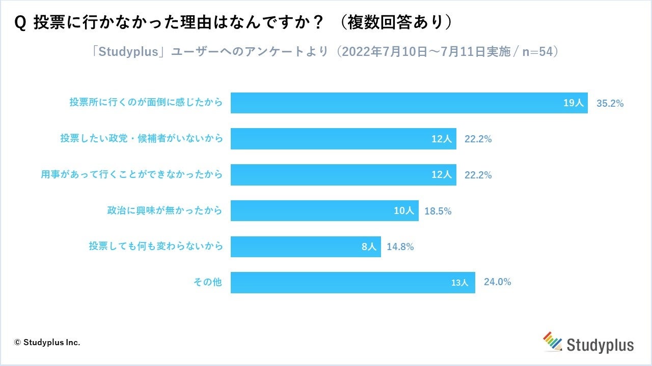 ・「投票したい政党・候補者がいないから」「用事があって行くことができなかったから」もそれぞれ22.2%。「その他」の回答を見ると、「学校のテスト期間が選挙1週間前だったことと、受験勉強に忙しいことから政治家に関する情報収集をしている余裕がなかった。」「コロナになったから」などが見られた。