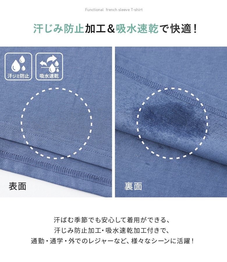 汗ばむ季節も快適な汗じみ防止機能がついたTシャツ。つるっとした表面感でシワになりにくくお手入れが簡単。