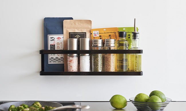 置き場所に困る袋入り調味料やスパイス、トレーの収納にも。
