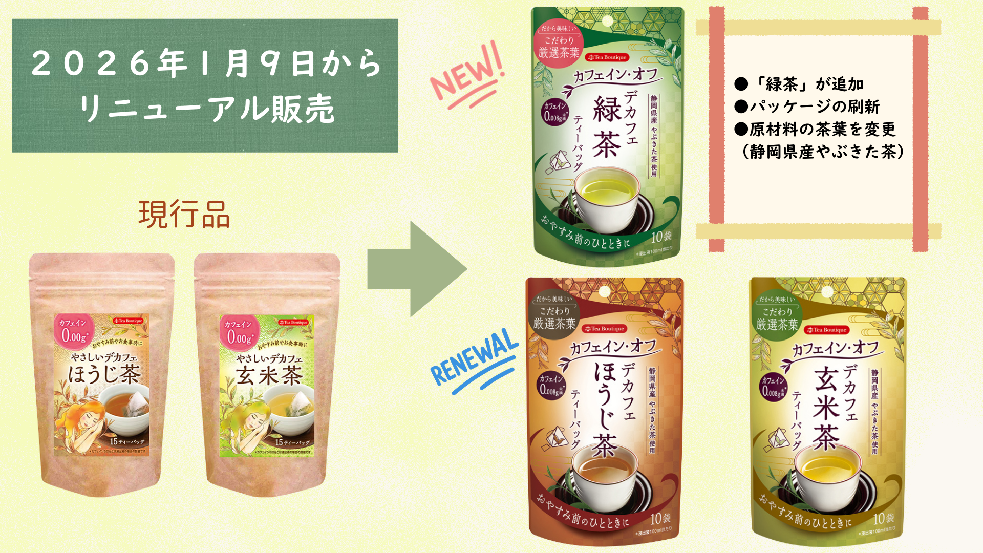 【カフェイン・オフ】パッケージを刷新&茶葉を静岡県産やぶきた茶へ変更してますますおいしく!リニューアルした「ティーブティック デカフェ日本茶シリーズ」が2026年1月9日(金)に全国販売スタート
