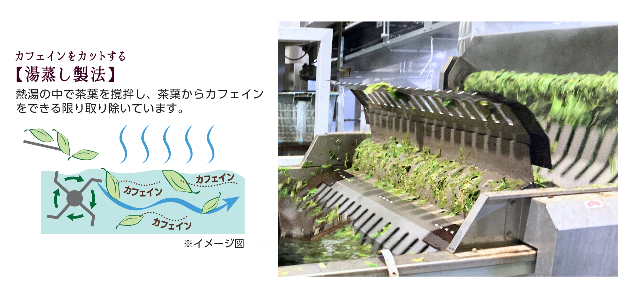 「ティーブティック デカフェ日本茶シリーズ」は「湯蒸し製法」という製法でカフェインを極力取り除いていますので※2、お食事中やおやつ時はもちろん、お休み前やカフェインを控えたいときにもおすすめです。お好きなときに、幅広い世代の方々に「カフェイン・オフ」の日本茶を楽しんでいただけます。