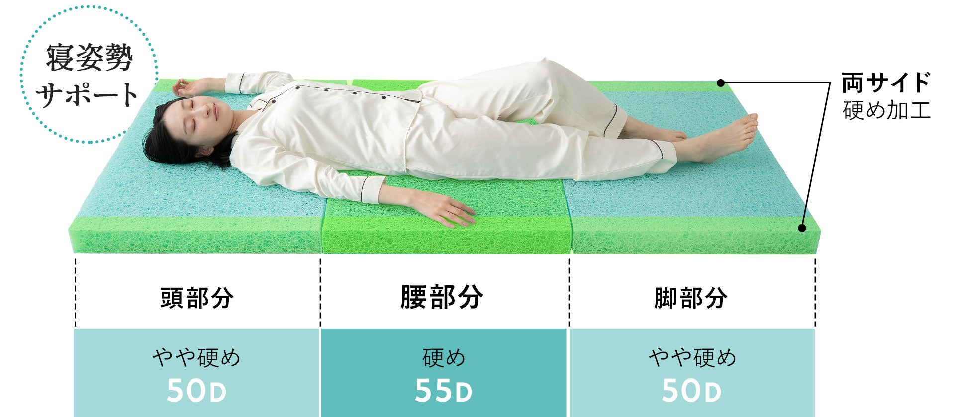 「頭・腰・脚」の3つの部位に合わせた3ゾーン設計を採用。腰部分は沈み込みを防ぐため硬めに設計されており、頭や脚部分は腰部分より軽い触感にすることで、寝返りがしやすく、自然な寝姿勢を維持します。さらに、型崩れのしやすい両サイドも硬め加工がされており、ベッドの上に敷いて腰掛けたときの落ち込みを防ぐ配慮もされています。