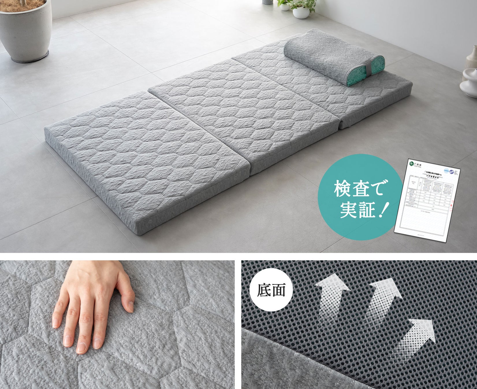 使わない時は三つ折りでコンパクトに収納可能。床でもベッドでも使用でき、寝室から来客用まで幅広く活躍します。シングル・ダブル・クイーンサイズと3サイズ展開です。