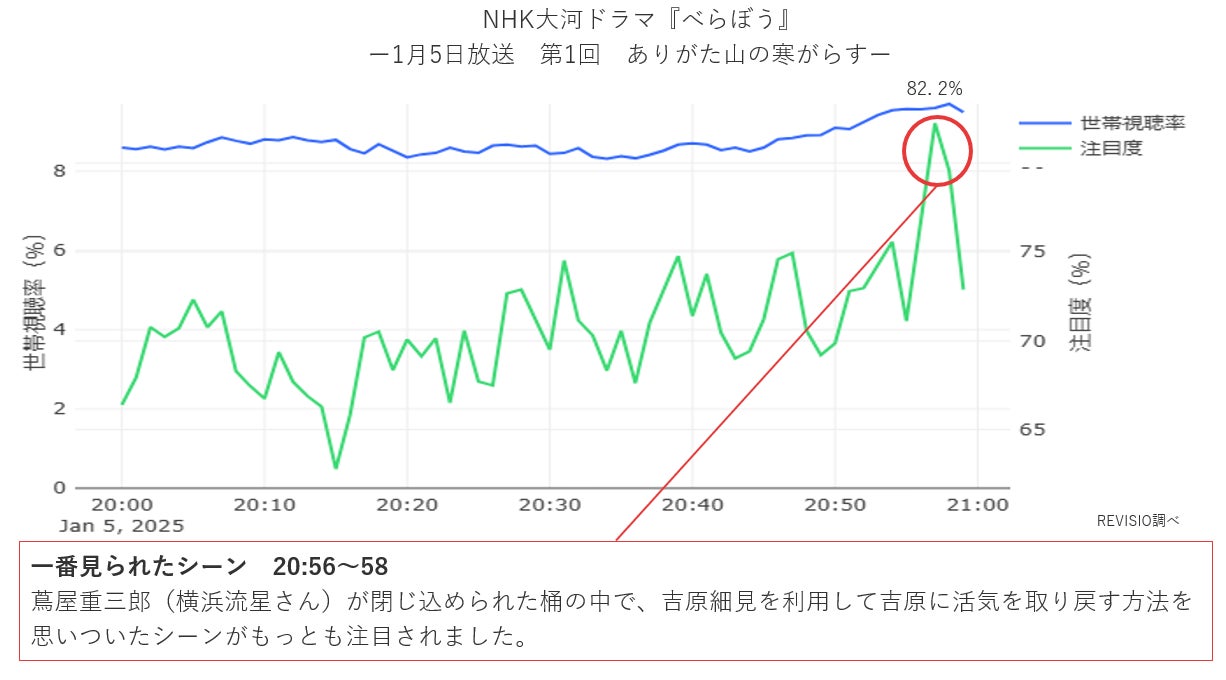 ご家庭に人体認識技術を搭載した機器を設置し、テレビスクリーンへの「アテンション(注視)」を測るREVISIO株式会社(本社:東京都千代田区、代表取締役社長 郡谷康士、以下REVISIO)は、2025年1月にスタートした森下佳子さん脚本・横浜流星さん主演の『べらぼう』の視聴質分析を公開しました。