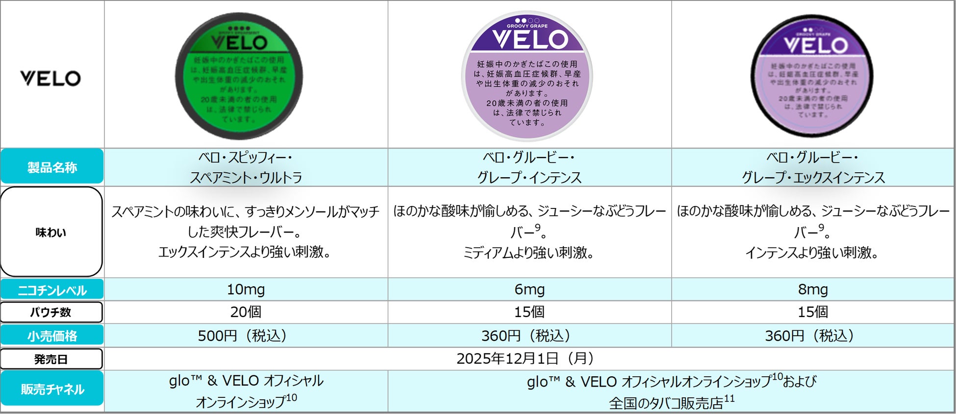 ブリティッシュ・アメリカン・タバコ・ジャパン合同会社(BATジャパン、本社:東京都港区、代表:エマ・ディーン)は、いつでもどこでも楽しめる、オーラルたばこ「VELO(ベロ)」から、新たに「ベロ・スピッフィー・スペアミント・ウルトラ」と「ベロ・グルービー・グレープ・インテンス」、「ベロ・グルービー・グレープ・エックスインテンス」の3銘柄を2025年12月1日(月)より発売します。「ベロ・スピッフィー・スペアミント・ウルトラ」はglo™ & VELOオフィシャルオンラインショップ[2]にて販売し、「ベロ・グルービー・グレープ・インテンス」及び「ベロ・グルービー・グレープ・エックスインテンス」は同オフィシャルオンラインショップに加え、全国のたばこ販売店[3]で順次販売いたします。