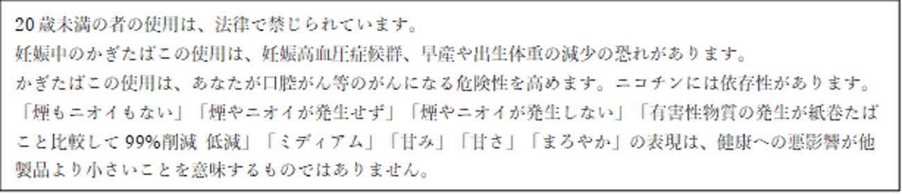 BATグループでは、たばこ製品のマーケティングを適切に実施するために国際的な自主規準を設定しています。そのため消費者に対するたばこ製品に関するすべてのコミュニケーションには、20歳未満の方へのコミュニケーションをお控えいただくとともに、「喫煙と健康に関する注意文言」を表示することを関係各位にお願いしております。加熱式たばこに関しては、記事掲載していただく際には、「健康に関する注意文言」が表示されるようご配慮いただきたく存じます。ご協力の程、何卒よろしくお願い申し上げます。
