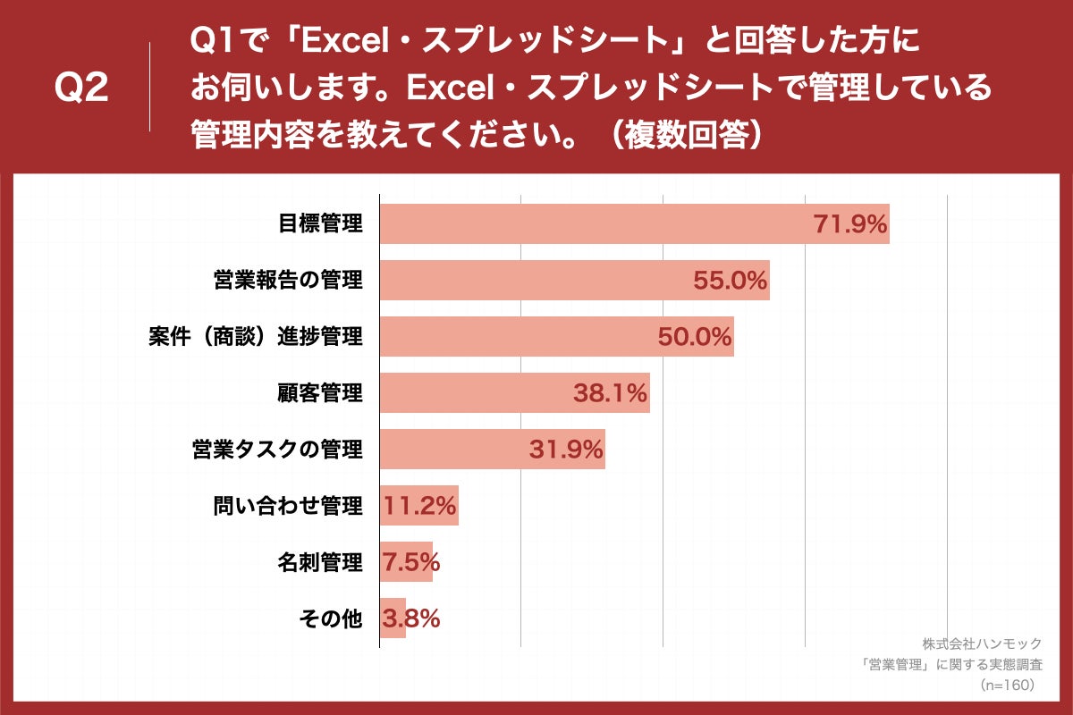 - Excel・スプレッドシートでの管理内容、「目標管理」が71.9%、「営業報告の管理」が55.0%