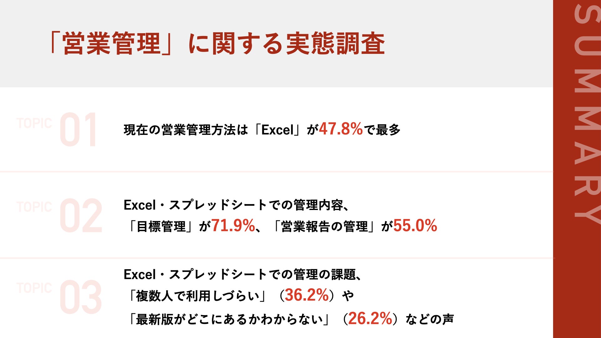 【営業管理ツールの利用実態調査】約5割の営業管理職が「Excelで管理している」と回答。そのうち約8割がExcel管理に課題を認識