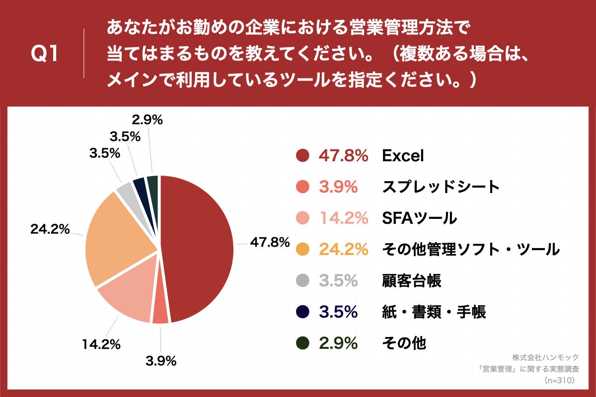 「Q1.あなたがお勤めの企業における営業管理方法で当てはまるものを教えてください。(複数ある場合は、メインで利用しているツールを指定ください。)」(n=310)と質問したところ、「Excel」が47.8%、「スプレッドシート」が3.9%という回答となりました。