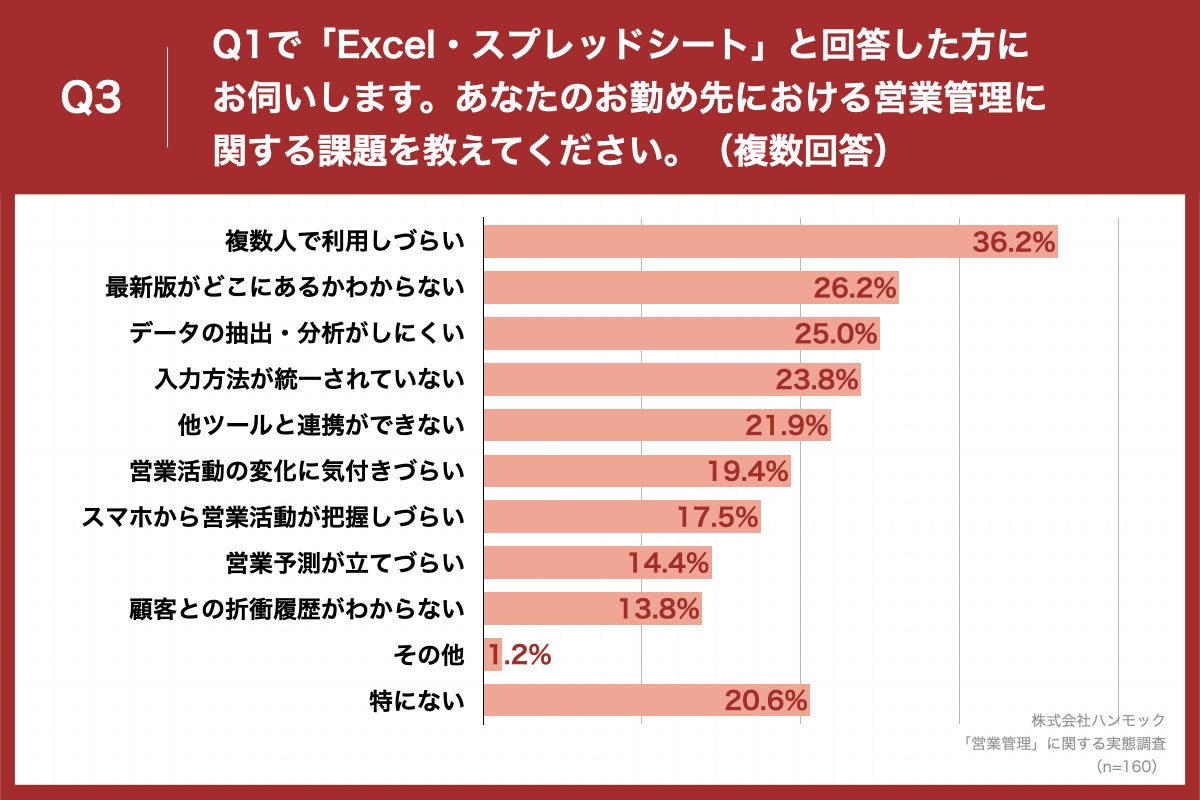 - 営業管理に関する課題、「複数人で利用しづらい」(36.2%)や「最新版がどこにあるかわからない」(26.2%)など
