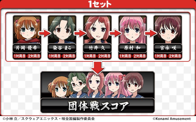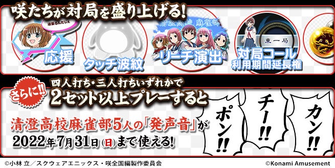 また、期間中に条件を満たすと、『咲-Saki-全国編』にちなんだ演出を使用できます。さらに、期間中に「団体戦」をプレーして応募した方の中から抽選で、『咲-Saki-全国編』デザインのオリジナルe-amusement passカードが当たるキャンペーンを開催します。