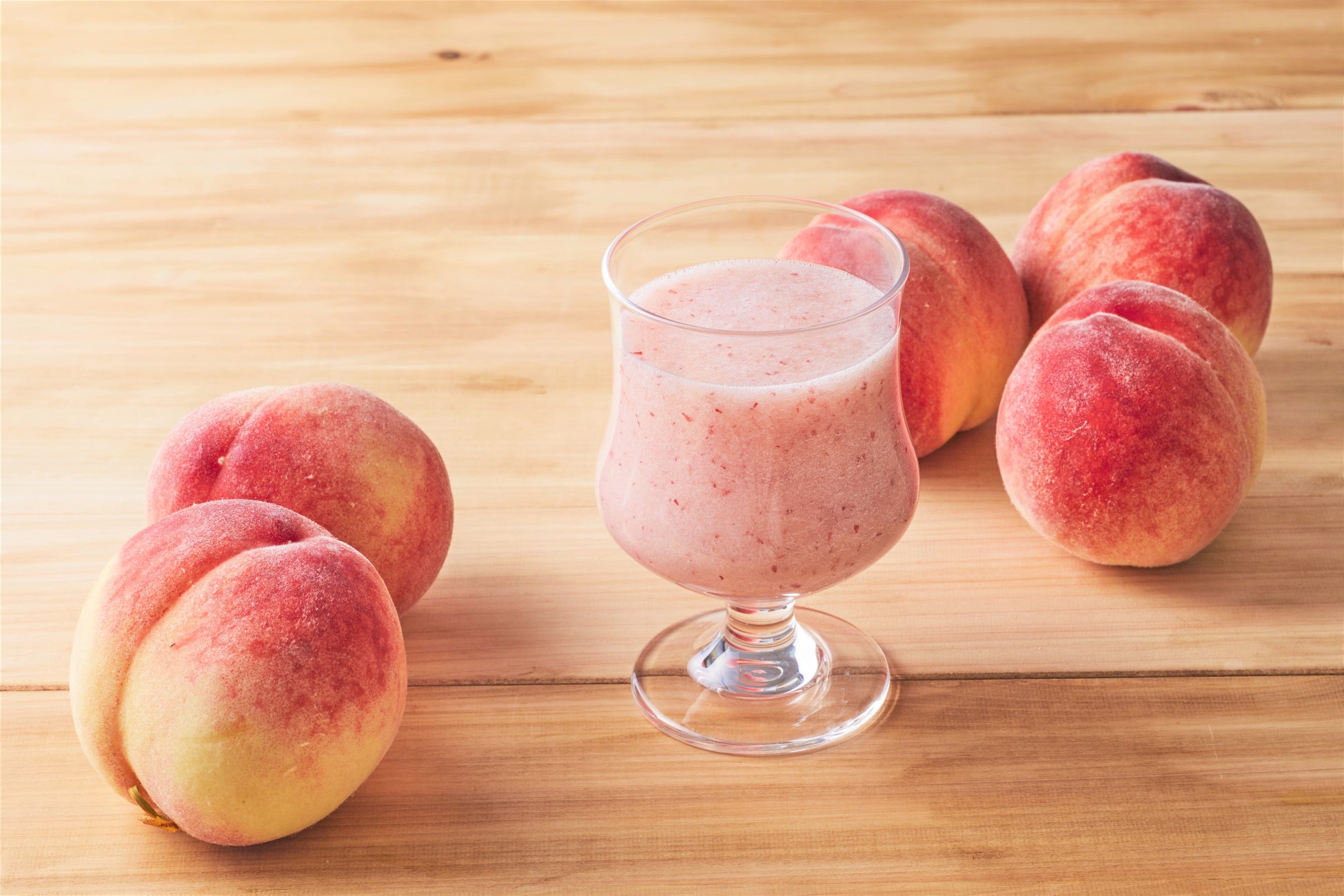 桃は100gあたり38kcal(※)とカロリーは意外にも低く、抗酸化作用を持つビタミンEや、便秘予防の効果が期待できる食物繊維などの栄養素を含む、体にうれしいフルーツです。当社の桃を使用したドリンクは、その時期に美味しい様々な品種の桃を皮ごと使用しており、桃が持つ魅力をそのままお楽しみいただけます。