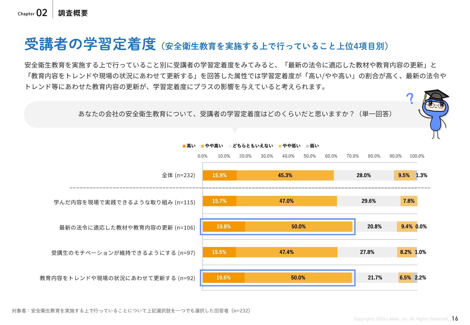 4. 安全衛生教育を実施する上で行っていることを調査したところ、「最新の法令に適応した教材や教育内容の更新」が上位となった。更に、その取組みを意識的に行っている回答者の学習定着度を確認したところ、「高い」「やや高い」の割合が他の取組みと比較して高い結果となった。教材内容の更新は、学習定着度にプラスの影響を与えていると考えられる。
