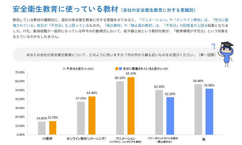 1. 自社の安全衛生教育について、約7割の回答者が「不充分である」と回答したことから、教材タイプ別に、充分/不充分の割合を確認したところ、「紙の教材」や「静止画の教材」は、「不充分」の回答者が「充分」よりも上回る結果となった。