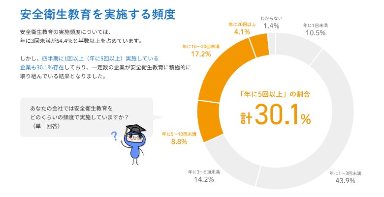2.安全衛生教育の実施頻度は年に3回未満が54.4%と半数を占めているものの、四半期に1回以上実施している企業も30.1%存在しており、一定数の企業が教育を積極的に取り組んでいることがわかった。