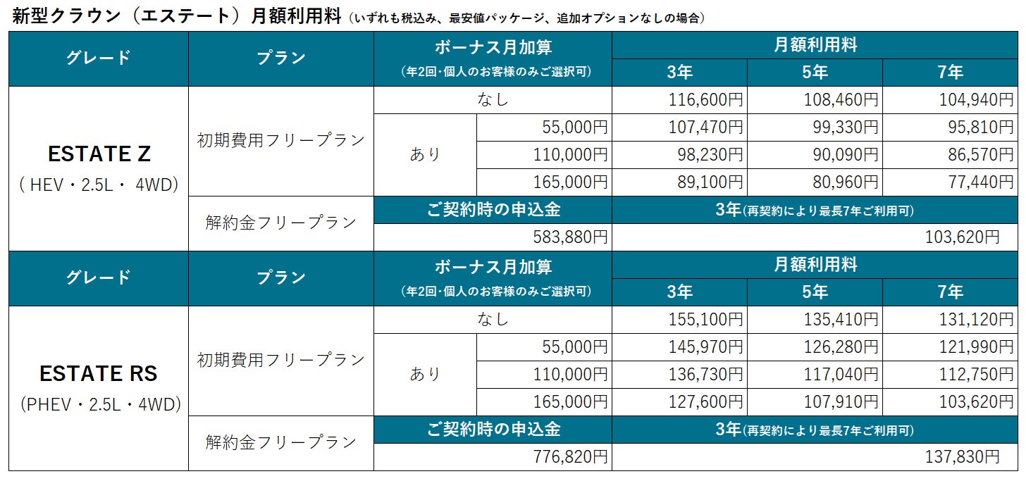 *4 <新型クラウン(エステート)ハイブリッド車(モデリスタ仕様)>最安値パッケージ、追加オプション無し、「初期費用フリープラン」の7年契約・年2回のボーナス月加算165,000円(税込み)の場合。7年間の総支払額は、9,156,840円(税込み)