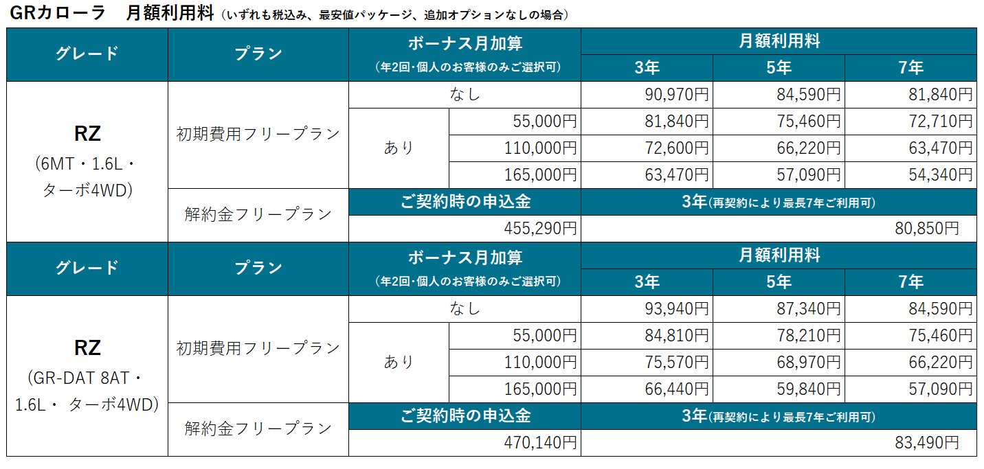*5 <GRカローラ RZ(6MT)>最安値パッケージ、追加オプション無し、「初期費用フリープラン」の7年契約・年2回のボーナス月加算165,000円(税込み)の場合。7年間の総支払額は、6,874,560円(税込み)