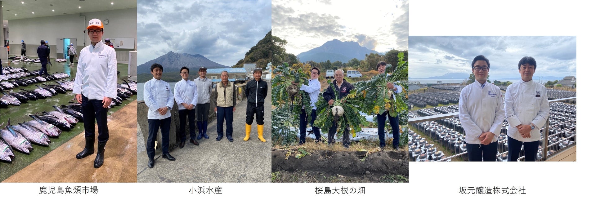 シェフ髙木が九州の魅力あふれる食を求め、新鮮な食材が豊富な鹿児島へ赴きました。「鹿児島魚類市場」では今回のフェアで登場するソデイカや月日貝を始め、水揚げされたばかりの様々な海の幸を視察。温暖で自然豊かな鹿児島の海で育つ“極上カンパチの”養殖所「小浜水産」や、黒酢が作られる圧巻の壺畑がある「坂元醸造」も訪問、見事に育った桜島大根の畑で収穫体験をするなど、生産者のみなさまと直にふれあいながら、食材を精選してまいりました。