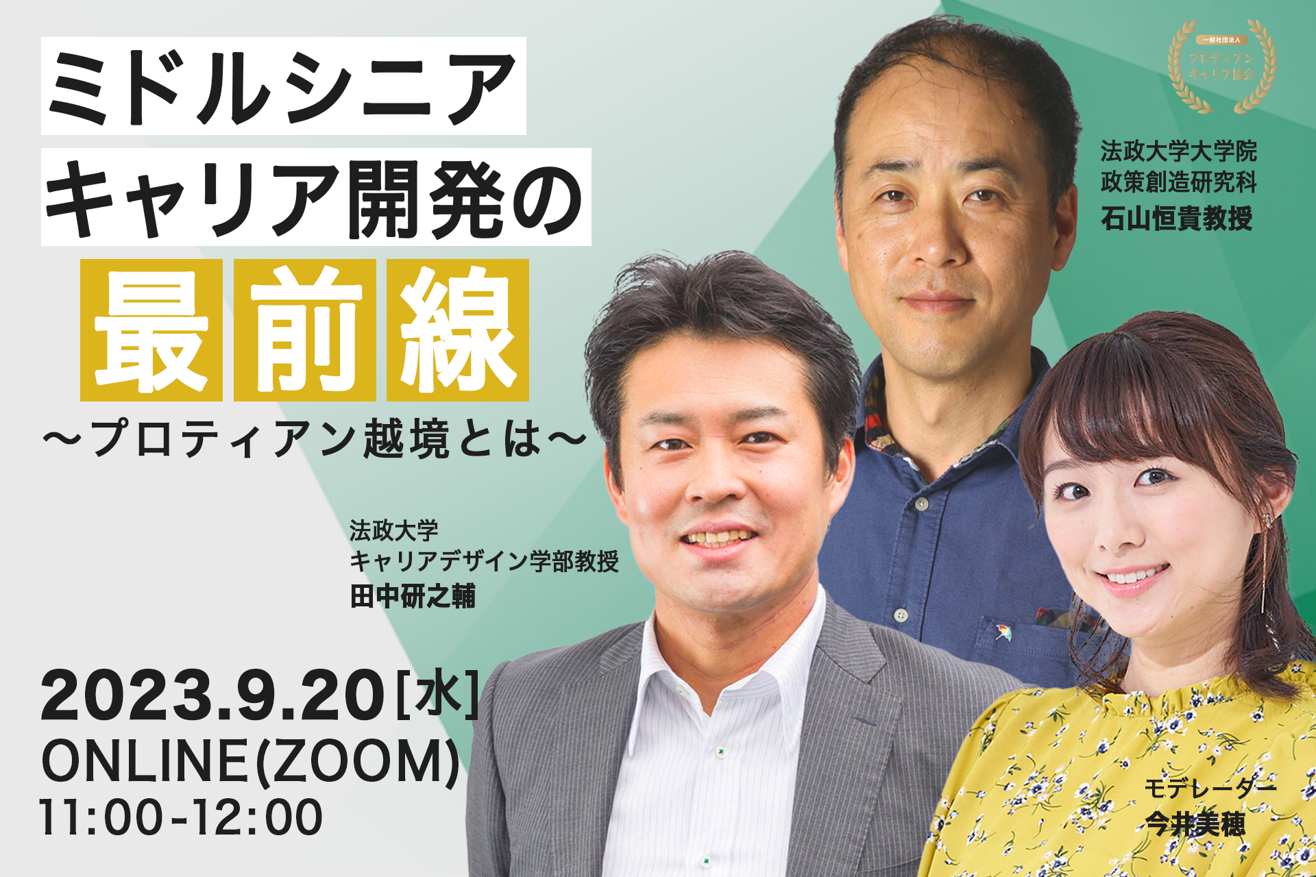 また、神プロテウスのように、社会の変化に応じて、自分の意思で自由に姿を変え、形成していくプロティアン・キャリア理論の日本の第一人者である当協会の代表理事/法政大学キャリアデザイン学部教授 田中研之輔が、ミドルシニアのキャリア開発について石山氏とディスカッションを実施します。