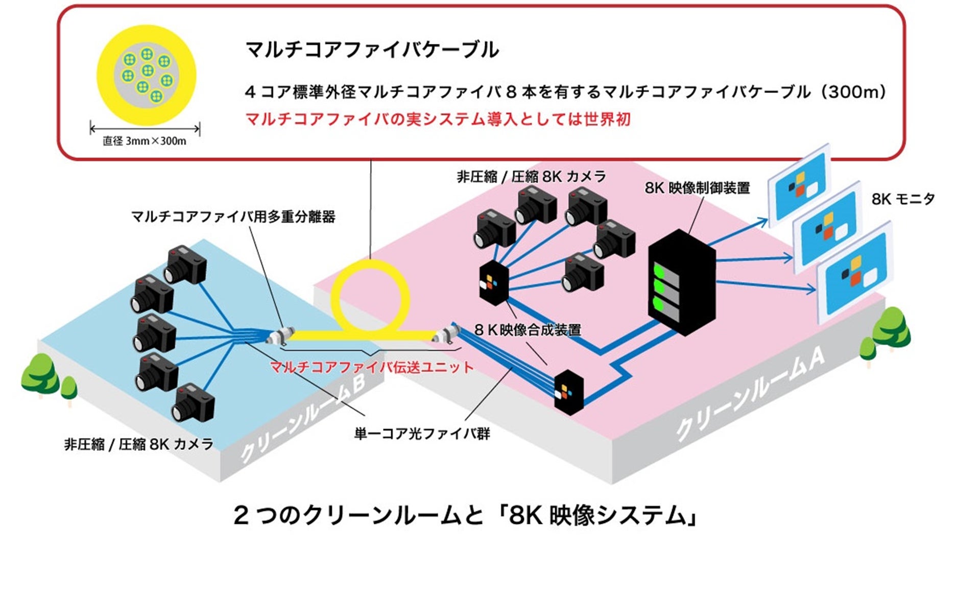 今回、マルチコアファイバケーブルを用いた伝送ユニットを導入することにより、僅かしか余裕のない情報配管や建物内のスペースを通し、クリーンルーム内に設置された複数の8Kカメラからの大容量映像データを、別の建物に有る8K映像合成装置までの300 mを伝送し、安定したシステム動作を実現することに成功しました。