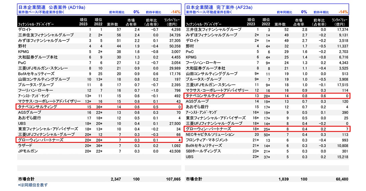 タナベコンサルティング、グローウィン・パートナーズ、リフィニティブが発表する「日本M&Aレビュー 2023年 上半期」にランクイン