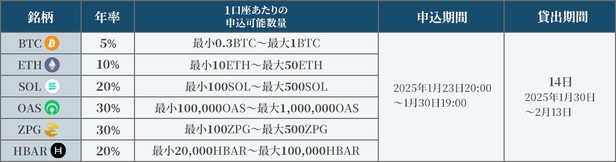 【大口でお取引をされるお客さま限定】優遇年率の貸コインのお知らせ~年率BTC5%、ETH10%、SOL20%、OAS30%、ZPG30%、HBAR20%~