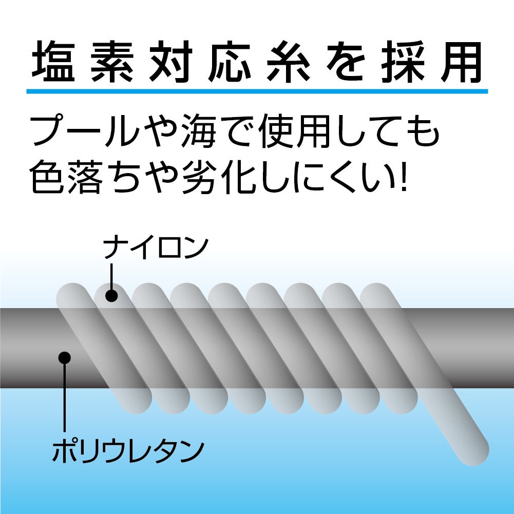 暑さ対策(気化冷却効果)、水陸両用(塩素対応糸採用)、動きやすい伸縮生地、着圧効果、抗菌防臭、紫外線対策(UVカット率99%)、近赤外線85%カット、UPF最高ランク50+