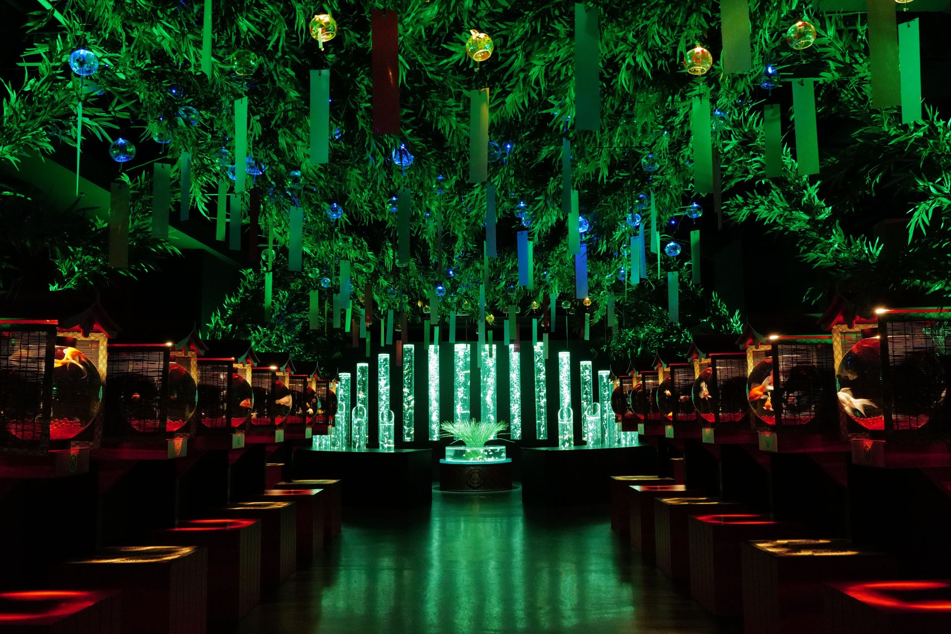 和のテイストを中心にエレガントな色の様々な花を咲かせて演出しました。お花が上から舞う、まるでお花畑に迷い込んだかのような幸せの幻想空間になっています。金魚と華道が融合する、華やかな美しさをご堪能ください。