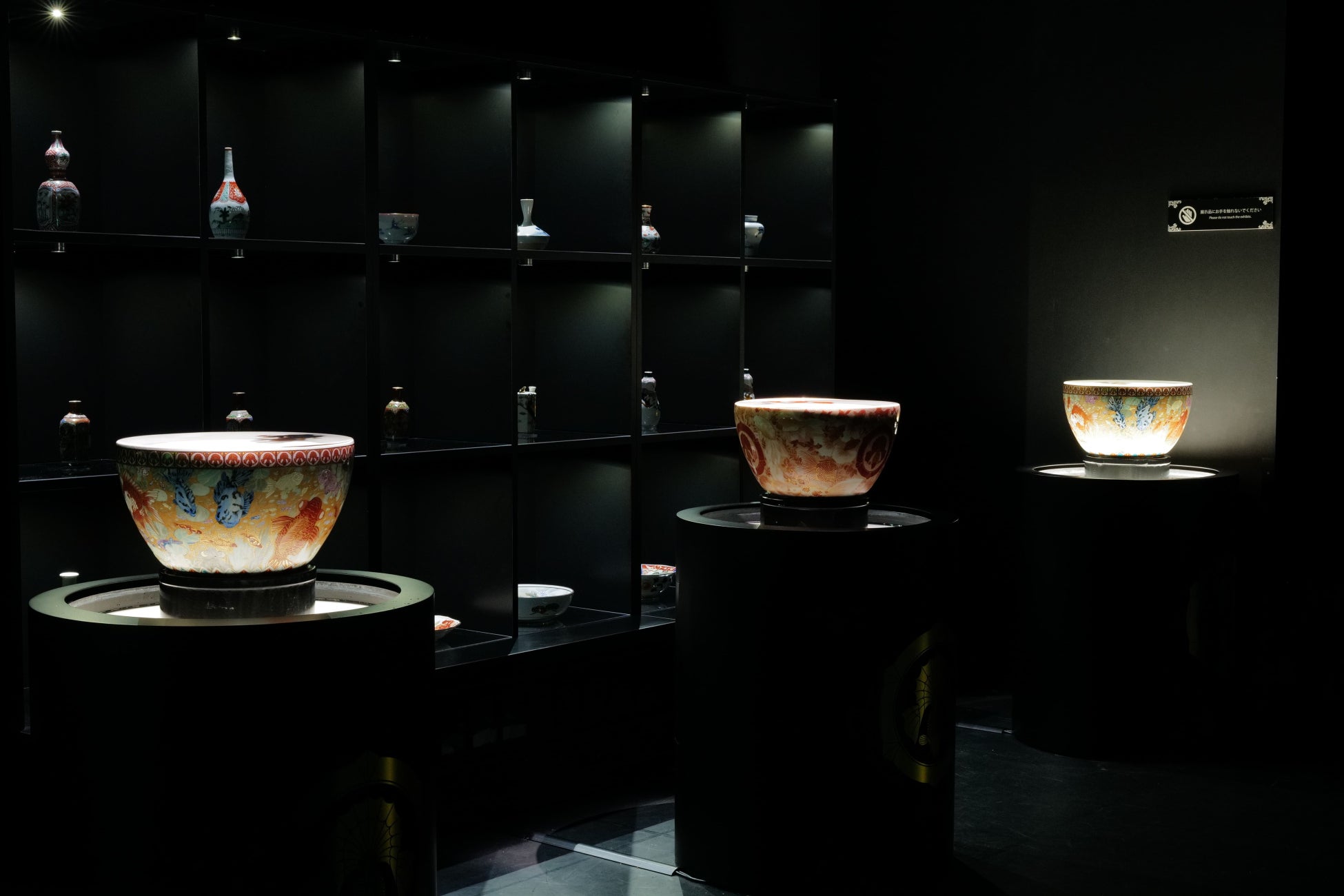 日本の伝統工芸である九谷焼で制作された金魚品評。鮮やかな色彩と華やかな絵付け、さらにアートアクアリムの家紋が描かれた陶器の中を金魚が優雅に泳ぎます。