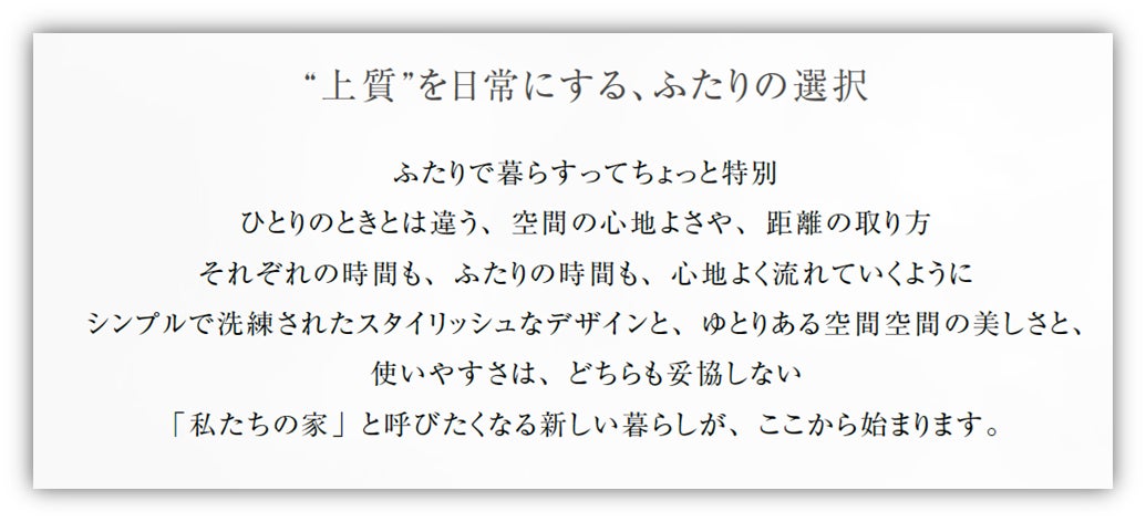“上質を日常にする、ふたりの選択”という新たなコンセプトを加え、ふたりで暮らす生活をより心地よくするための空間・導線・設備を備えたDINKS向け賃貸マンションシリーズです。