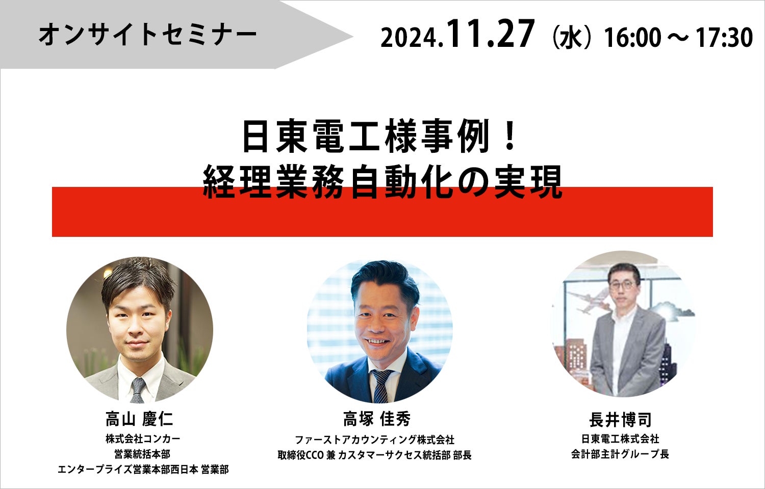 ファーストアカウンティング株式会社(本社:東京都港区、代表取締役社長:森 啓太郎、以下、ファーストアカウンティング)は、2024年11月27日に日本アイ・ビー・エム株式会社、株式会社コンカーとの共催にて「経理業務自動化」をテーマとしたオンサイトセミナーを開催します。