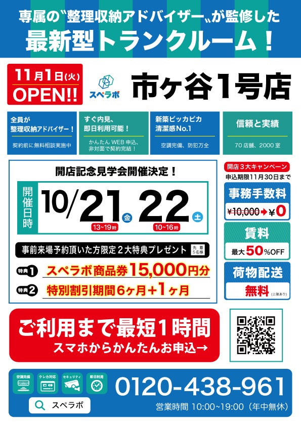 【11月1日(火)オープン】見学から契約、解約まで完全非接触・非対面、お申し込みからご利用まで最短1時間!都内にて絶賛運営中のトランクルーム【スペラボ】が千代田区市ヶ谷駅近くに出店!