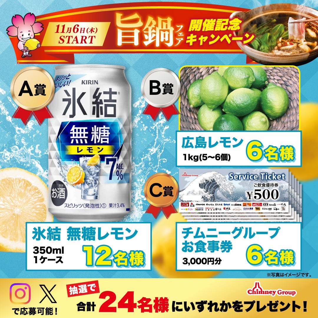 【旨鍋フェアスタート記念】チムニー公式SNSプレゼントキャンペーン開催!氷結や広島レモンなど豪華景品が当たる!