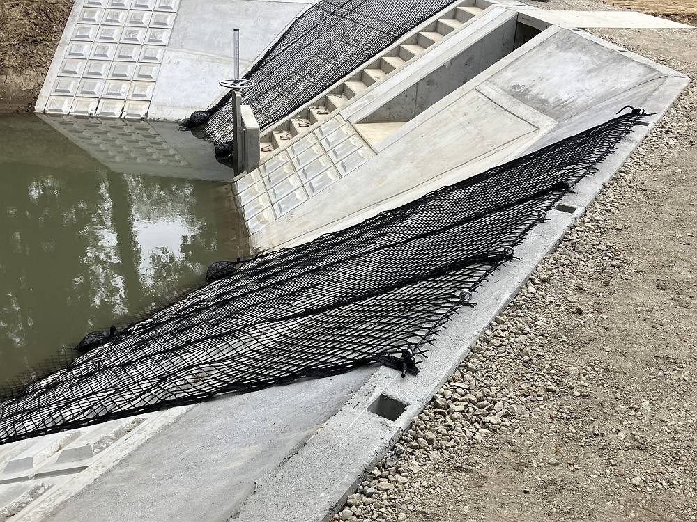転落事故防止対策の一つとして、ため池に誤って転落した場合に、脱出を補助する安全ネットの設置があります。ため池堤体の表面は、遮水シートや平ブロック(コンクリート)の場合滑りやすく、転落すると自力で登ることは困難です。