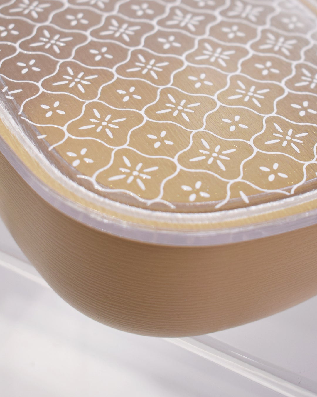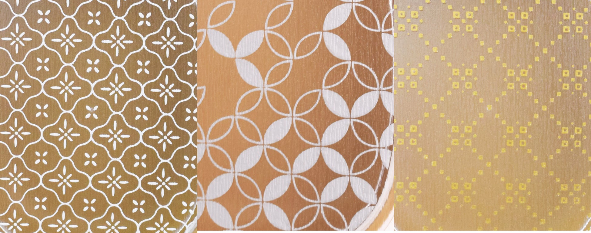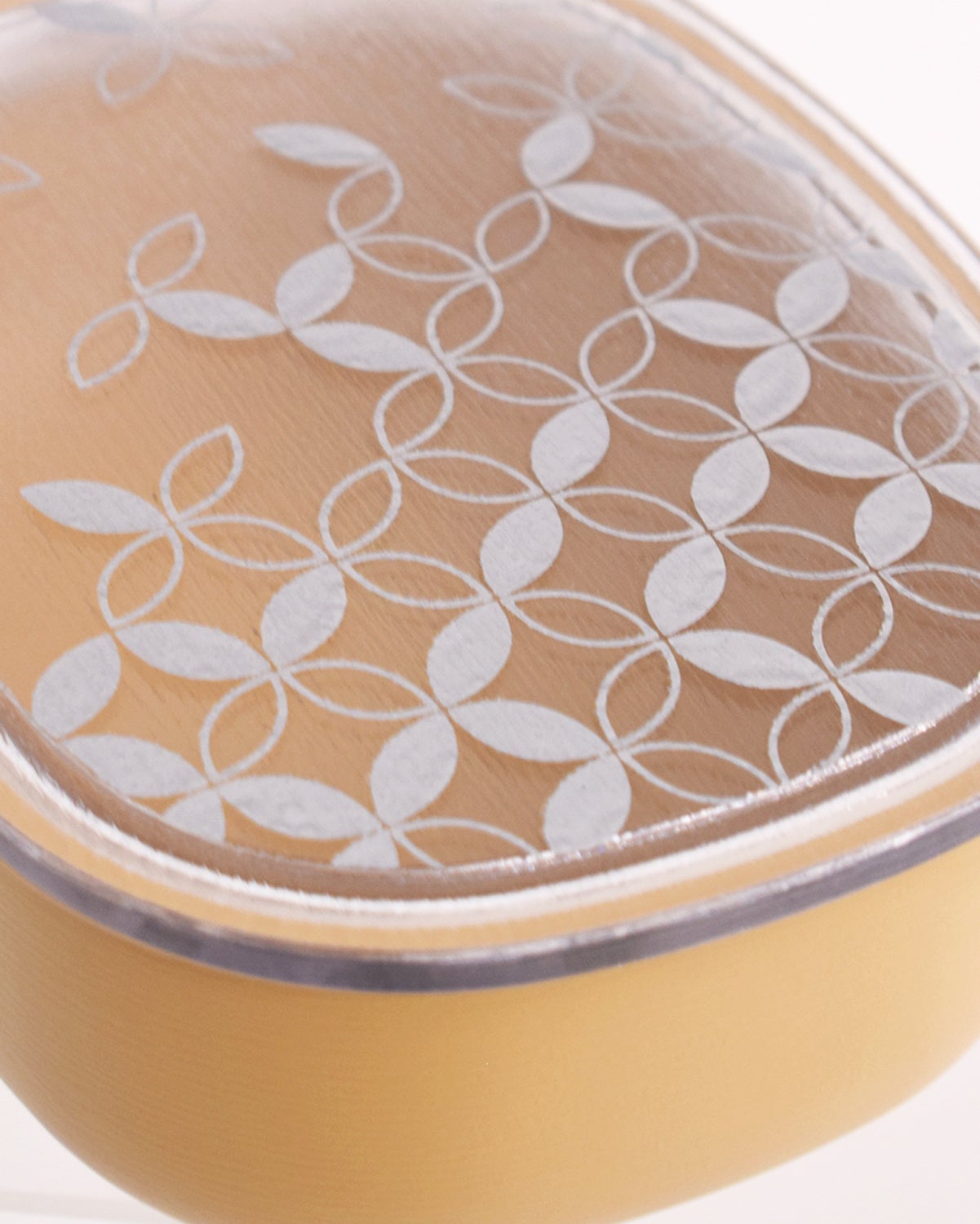 フタにすりガラスのような印象。透明なフタに凹凸の加工がされていて、モダンな柄がプリントされています。白木風の容器との組み合わせはみずみずしく新鮮な印象。フタには柄がプリントされています。古い窓ガラスや切子ガラス模様から着想を得た模様です。