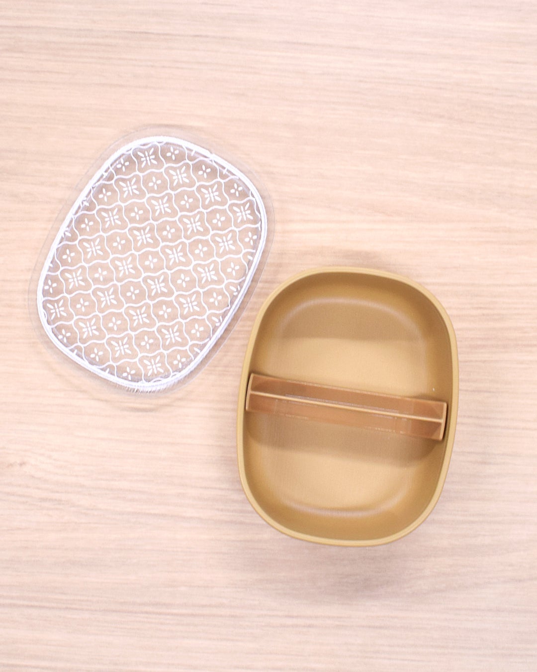 手になじみが良くシンプルな形状。容量610mlと扱いやすいサイズ感です。容器の深さ約5cm、仕切り付きでご飯とおかずを分けて盛り付けられます。