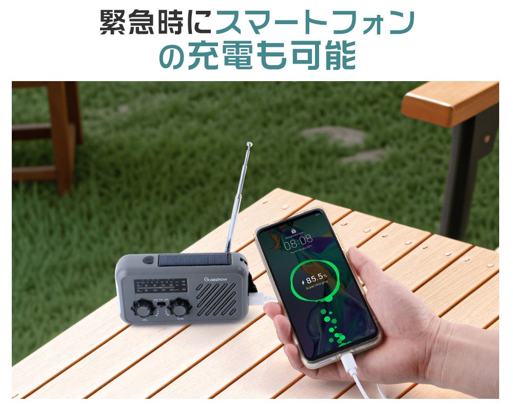 通信手段としてなくてはならないスマホも、災害時の電源確保に備えが必要です。ラジオを供給源として使えると予備バッテリーを温存でき、気持ちにも余裕が生まれます。