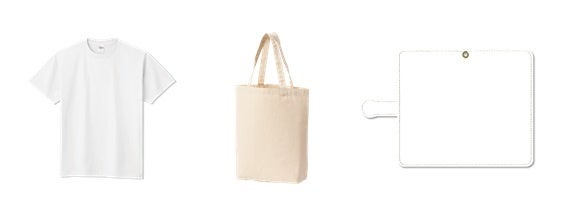 Tシャツやトートバッグ、手帳型スマホケースのアイテムをご用意しています。