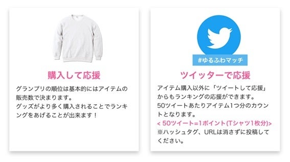 ランキングの投票は、①オリジナルアイテムの購入と②ツイート応援の2種類があり、誰でも気軽に参加できます。